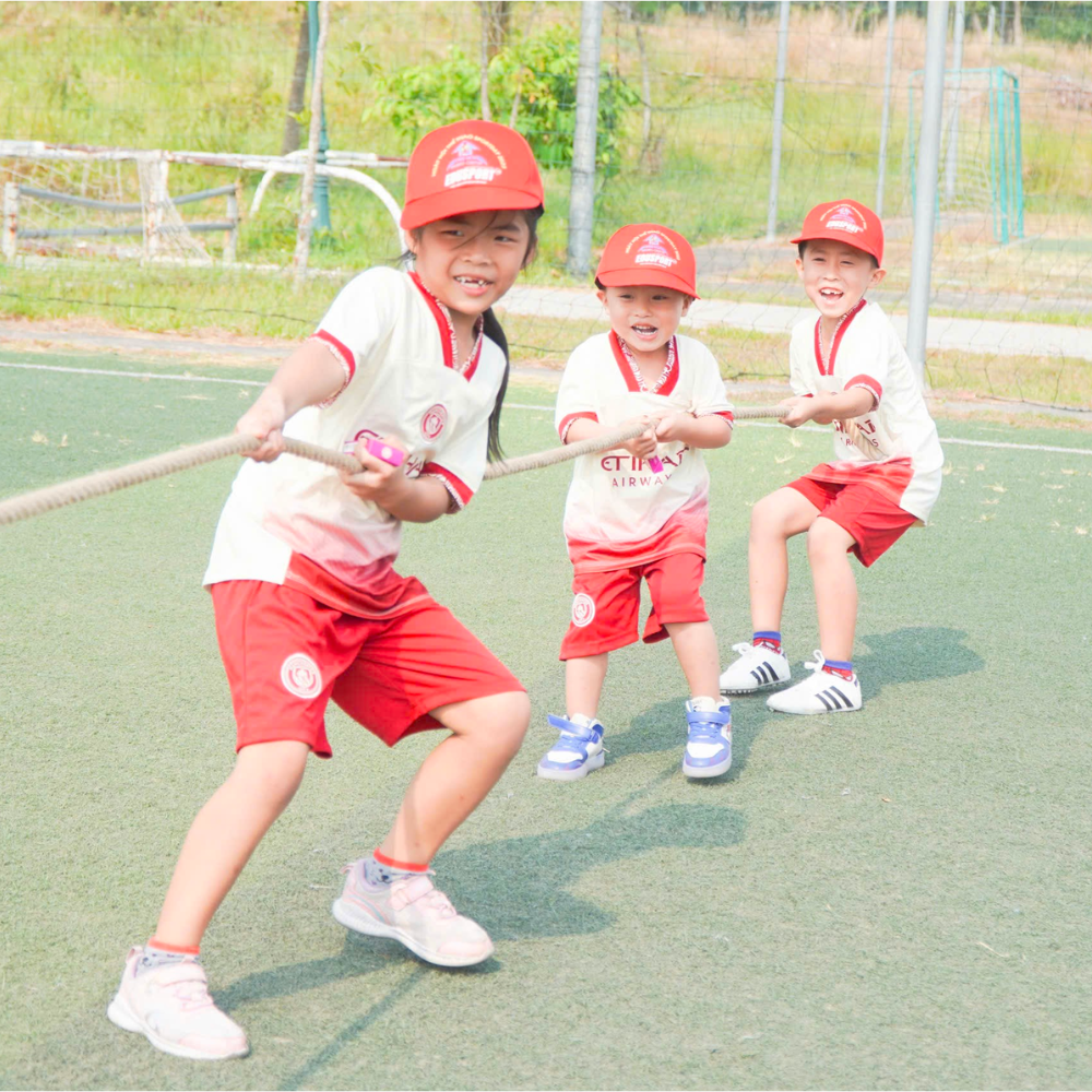 Nội dung giúp trẻ làm quen các môn thể thao cơ bản: bóng đá, bóng rổ, cầu lông. Tham gia trò chơi dân gian như nhảy dây, kéo co, trốn tìm, thả diều. Học kỹ năng cơ bản như kỹ năng giao tiếp, teamwork, sinh hoạt tập thể.